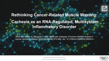 This slide deck summarizes recent research on cancer cachexia for an audience of life sciences professionals. It focuses on the study’s core findings, including the discovery of distinct molecular subtypes, the role of hyper-inflammation, the function of non-coding RNAs as master regulators, and the multisystem nature of cachexia. By distilling the article’s complex gene expression data into actionable insights, the presentation connects foundational research to emerging therapeutic strategies. This work exemplifies scientific storytelling that helps researchers and clinicians navigate new paradigms in cachexia biology.