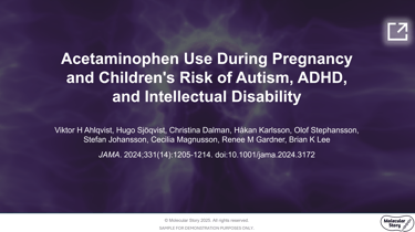 This presentation summarizes a 2024 JAMA study by Ahlqvist et al. on the link between acetaminophen use during pregnancy and neurodevelopmental outcomes in children. Drawing on data from 2.5 million Swedish children, the analysis applies sibling control methodology to demonstrate that familial confounding, rather than a causal drug effect, accounts for previously reported associations.