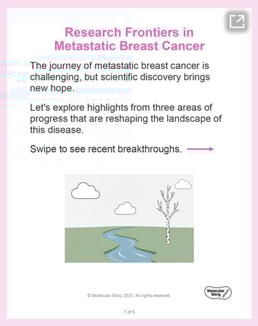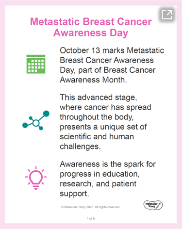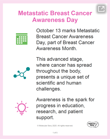 This slide deck was designed for a general/patient audience as part of a social media campaign for Metastatic Breast Cancer Awareness Day on October 13. It distills key disease information, including Canadian statistics and the meaning of the METAvivor ribbon, into a visually engaging and easily understood format. This work demonstrates the creation of accessible and impactful content for public and patient education.