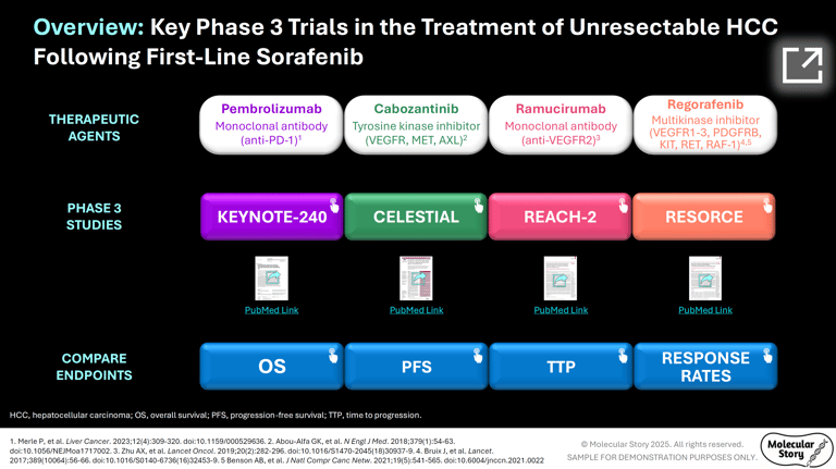 This interactive guide provides a detailed overview of second-line systemic therapies for unresectable hepatocellular carcinoma (uHCC) in patients who have progressed on first-line sorafenib. It summarizes and directly compares efficacy and safety data from four key Phase 3 trials.
